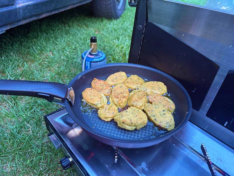 Fürs Camping wichtig ist außerdem, dass sie für alle Herdarten geeignet ist, also auch Gas! Wie die meisten von euch kochen wir beim Camping mit einem Gasherd und somit ist die Kompatibilität für uns Grundvoraussetzung. Aber auch auf Induktionsherden fühlt sie sich wohl. Die Pfanne ist aus recyceltem Aluminium hergestellt und ist beschichtet, sodass euer Essen nicht so schnell anbrennt.