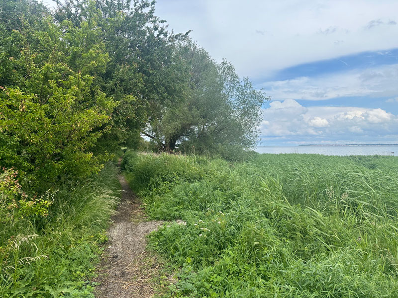 Trotz der Beschilderung und dem digitalen Kartenmaterial in Komoot ist es leider passiert, dass wir von unserer geplanten Strecke abgekommen sind. Das liegt daran, dass es teilweise in mehrere Richtungen mit der Route 40 weitergeht. In Kirke Såby wollten wir in den SPAR und dann dem Radweg an der Westküste des Roskilde-Fjords entlang nach Norden fahren. Kurz zuvor verpassten wir aber leider irgendwo die richtige Abfahrt und fuhren weiter nach Westen, ebenfalls auf der ausgewiesenen Route 40, aber trotzdem falsch. Wir landeten an der Westküste der Halbinsel anstatt der Ostküste. Nach Abwägen unserer Möglichkeiten entschieden wir uns dann erstmal an der Westküste nach Norden zu fahren. Den Einkauf mussten wir auf den nächsten Tag verschieben, fanden aber einen schönen Schlafplatz mit Meerblick.