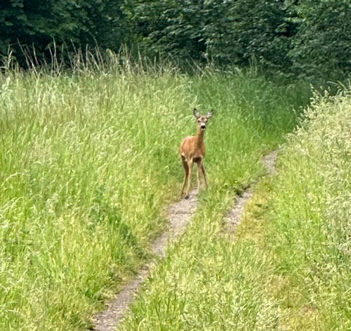 Straße. Nach ruhigen Wohngebieten landeten wir im Grünen wo wir leider nicht nur Rehe und einen Hasen sahen. Auch viele Fliegen tummelten sich hier und freuten sich über unseren Besuch. So war unser Schlafplatz durchaus abgelegen und ruhig, aber eben mit kleinen nervigen Stimmungskillern.